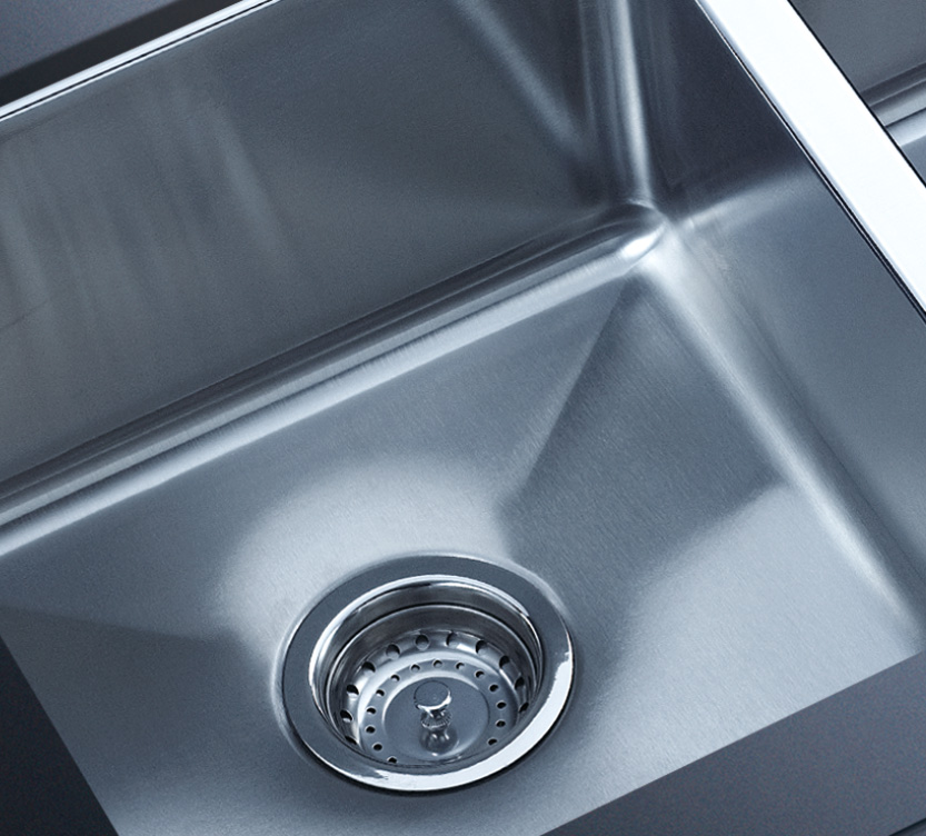 阿發水槽整體經拉絲處理,質地更加光滑,視覺更加柔和。能有效抵擋異物撞擊,刮傷及磨損,防止油污沾染,常用常新;柔和的光澤令水槽平添高雅氣質,更能避免鏡面材質反射的光污染